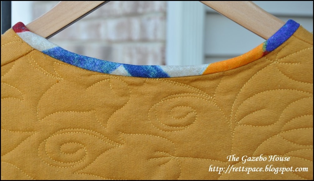 I cut apart a honey colored sweatshirt, laid it on my longarm & quilted the front, back & sleeves.