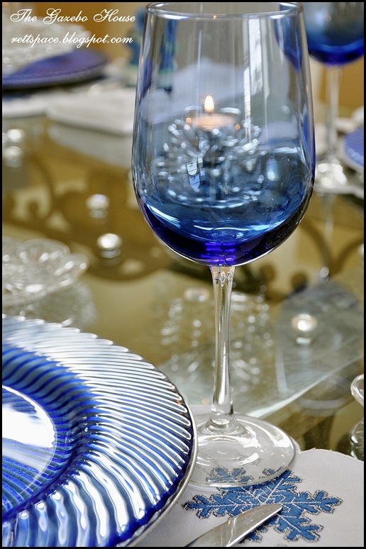 ReplyDeleteRett, Your tablescape is amazing! Love the crystal votive holder, love the blue plates and the snowman in the cloche. The colors say winter. You did great!