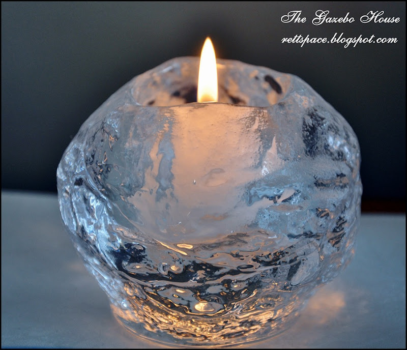 On the side table, is a Kosta Boda crystal snowball votive candle holder. These were very popular years ago & it seemed like everyone had them. It is very heavy & really looks pretty when lit, as you can see.