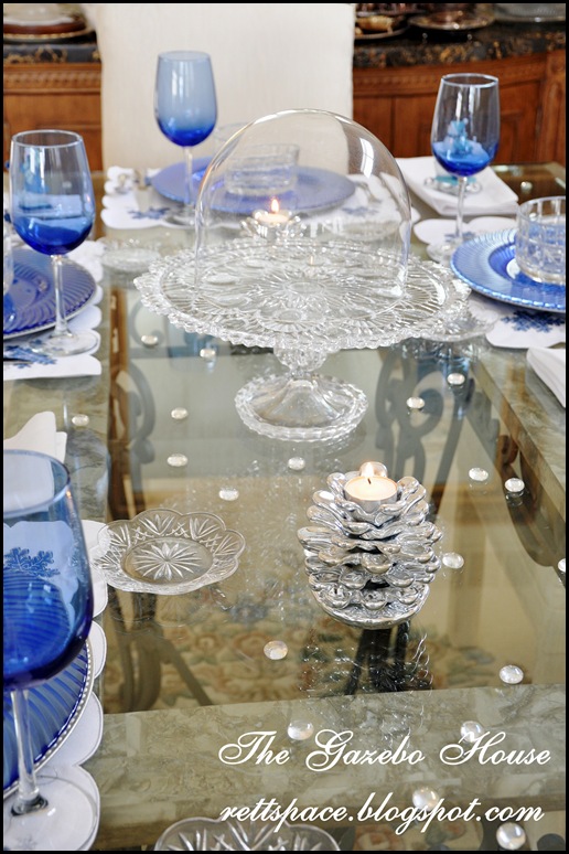 Beautiful Rett! What a love the most about your table is your wonderful reflections you captured in your glass tabletop of your crystal pieces and silver pine cone votive holders! And how could you NOT keep that adorable handmade snowman? I haven't been to Dollar Tree lately, but I bet they get more blue stems in. They always seem to have some on the shelves :)