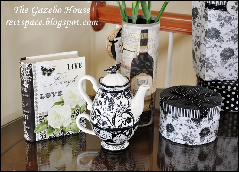 I combined a variety of patterns for this table...polka-dots, stripes, florals & LOTS of damask! I have several gift containers on the table for decoration, as well, since my daughter's birthday is this coming week & they just happened to fit the theme beautifully.